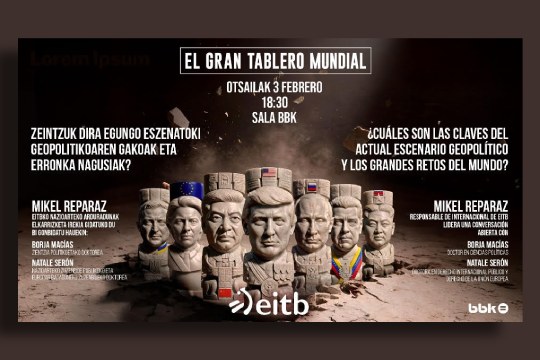 A las 18:30, la Sala BBK de Bilbao acogerá la charla-coloquio “El gran tablero mundial”, protagonizada por el periodista Mikel Reparaz, jefe de información internacional de EITB. El encuentro, con entrada gratuita e inscripción previa, propone una conversación abierta junto a expertos como Borja Macías y Natale Serón para analizar el actual panorama geopolítico y los grandes retos del mundo actual.